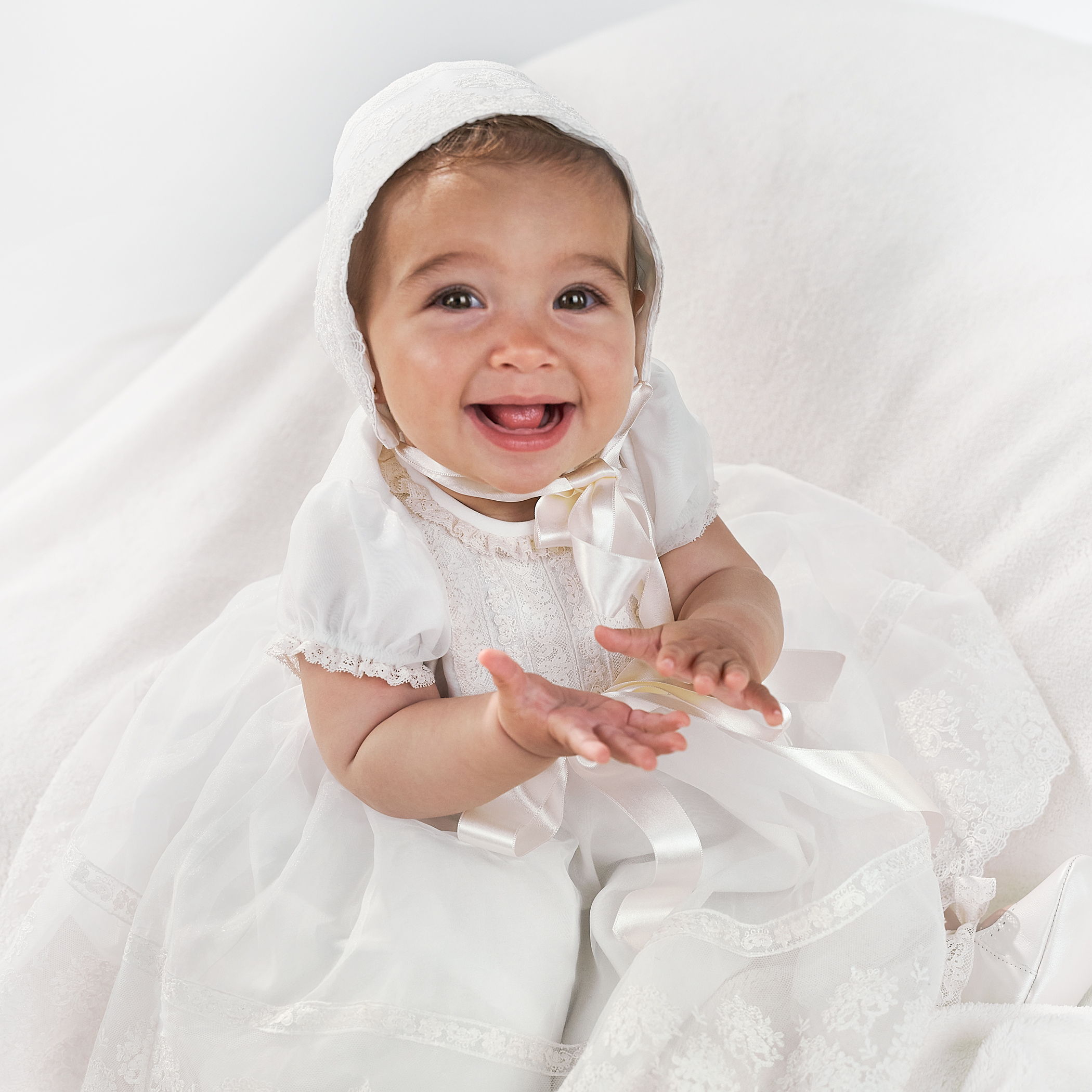 ¡Nuestra capota Crystal es tan bonita! Con su puntilla que envuelve la carita del bebé y se ata con cintas de satén a juego, hace de esta un accesorio imprescindible para tu evento especial. Y la parte trasera hace un bonito juego con los entredoses Valencié y el lacito de satén. Para mantener la comodidad y suavidad, la capota va forrada en popelín crudo.