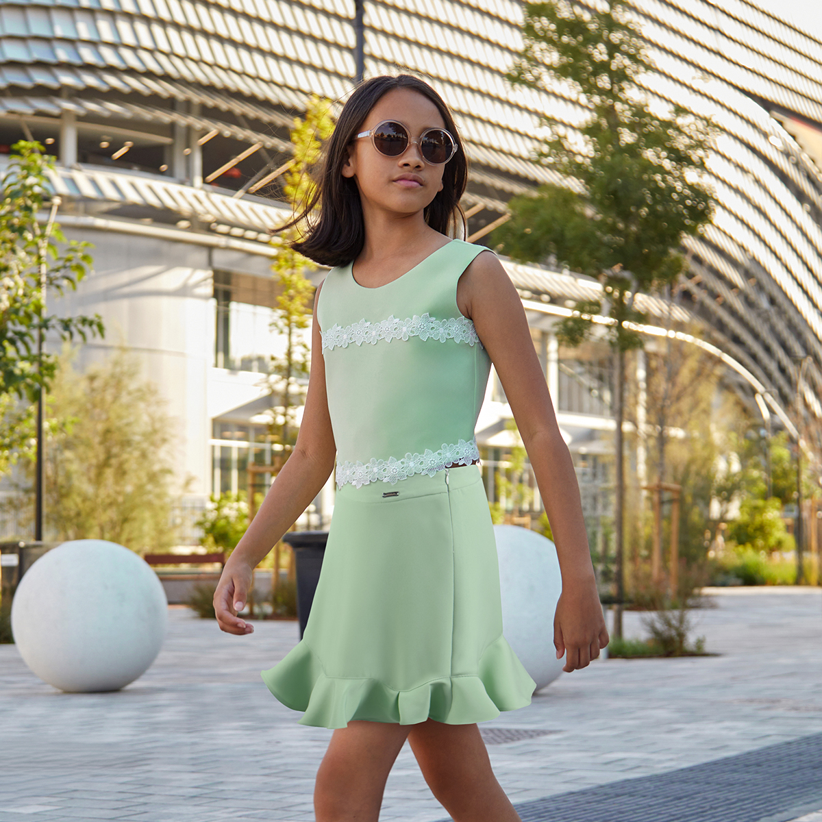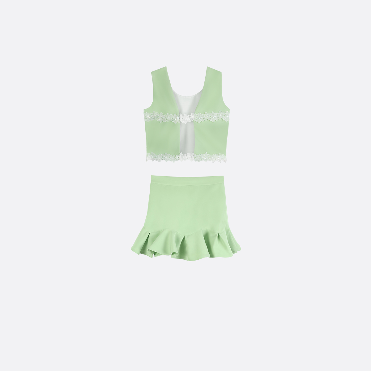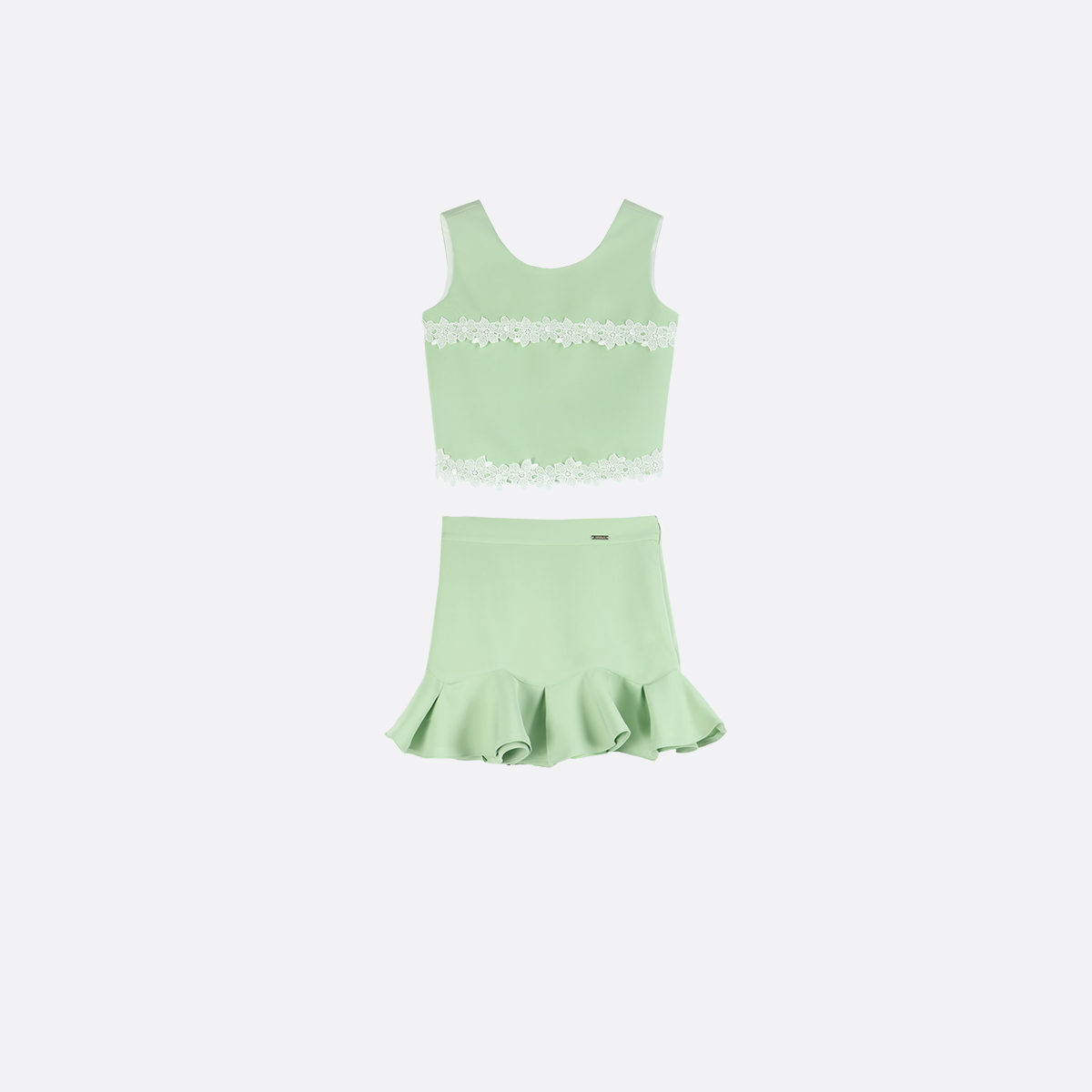 Conjunto junior en verde manzana con top de espalda abierta y entredoses bordados, mini falda fluida con lazada lateral.