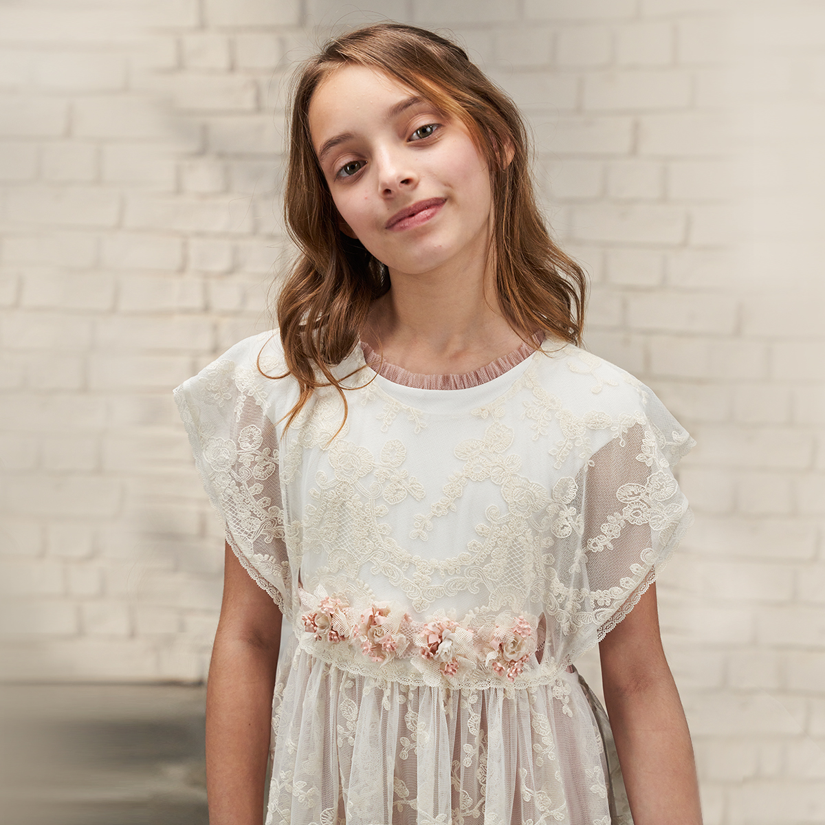 Belt in cotton ribbon embroidered with little flowers in pink and ecru tones.