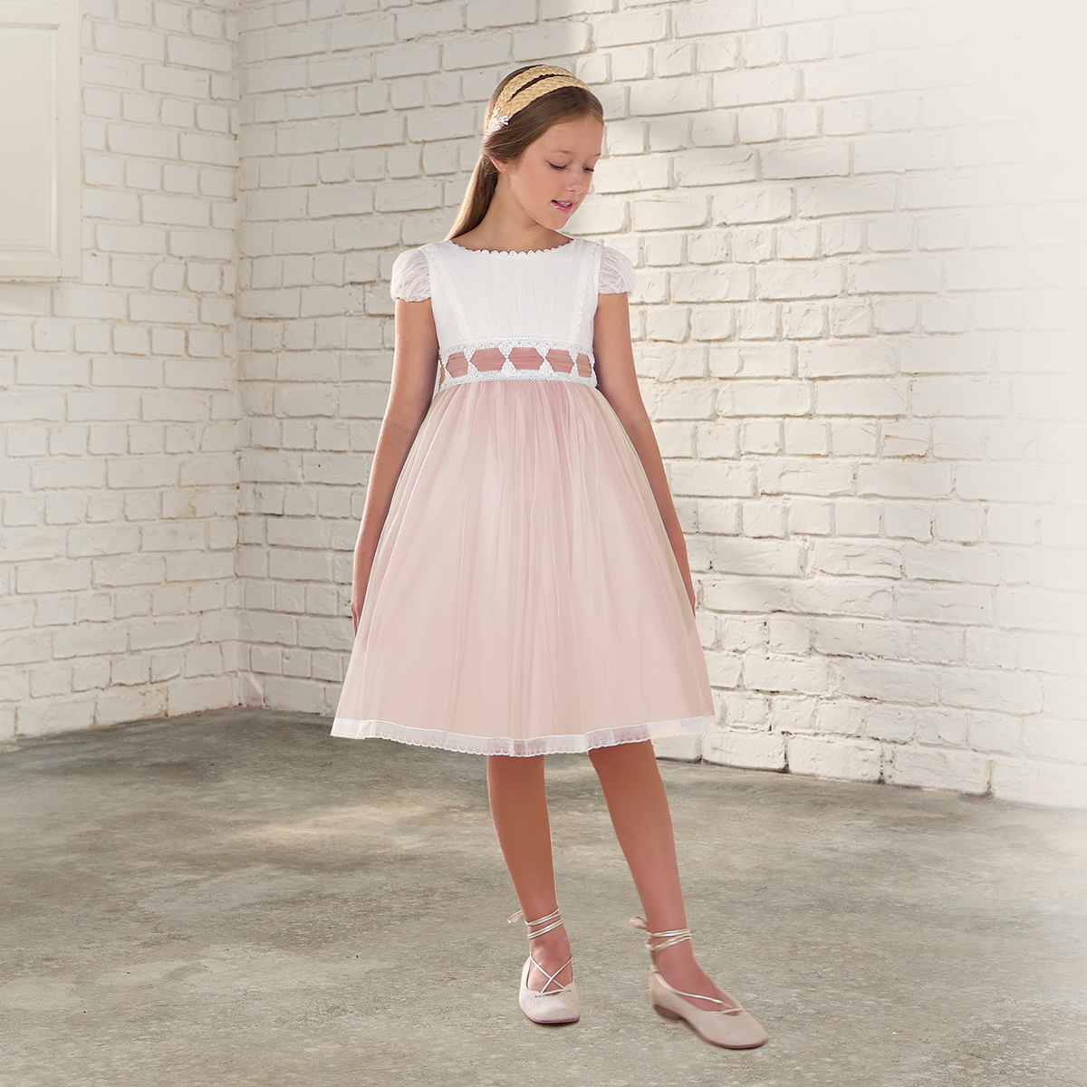 Short communion or ceremony dress in tulle and plumeti tulle with matching pink skirt and belt in abambulated organza.
