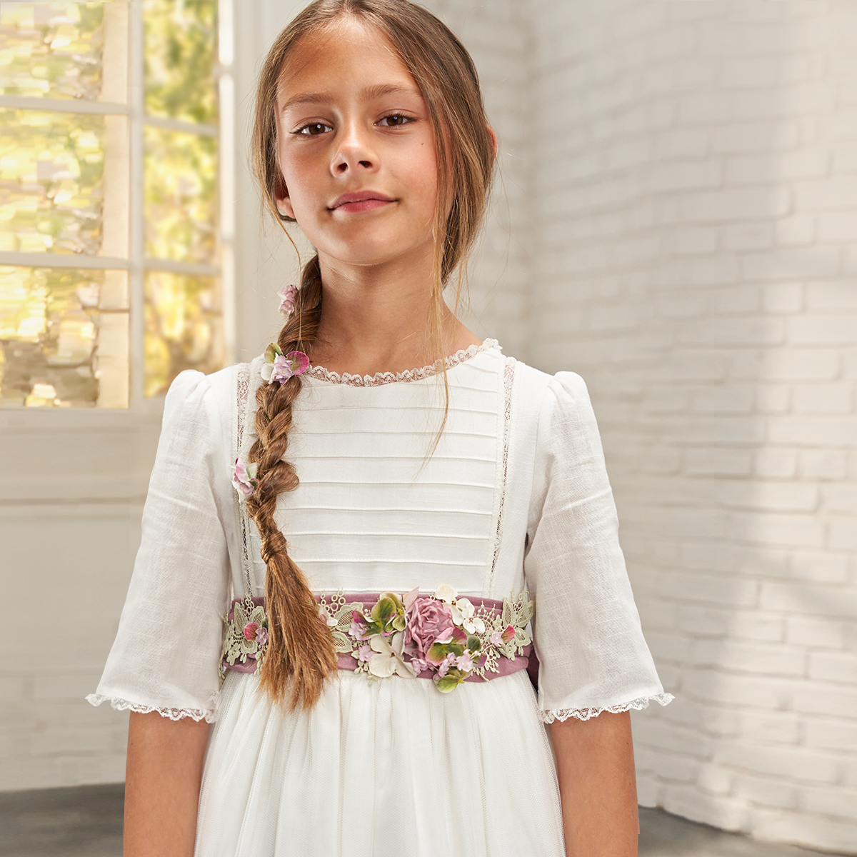 Belt with handmade and hand-dyed flowers in shades of powdered pink, ecru and green.