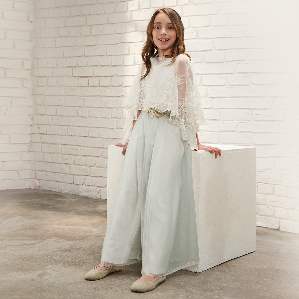 Mono de Comunión con Capelina realizada en un delicado bordado, hacen de este mono una opción perfecta para un dia tan especial. Donde podrás llevar la capelina para el momento de la ceremonia y quitarla para la celebración.